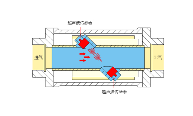 超聲波氣體傳感是根據(jù)超聲波傳播中聲速差的原理(又稱超聲波時(shí)差法)來計(jì)算氣體濃度和流速。超聲波在下游方向的傳播速度會(huì)增加,而在反方向的傳播速度會(huì)降低,通過一對(duì)超聲波換能器交替(或同時(shí))發(fā)射和接收超聲波。通過觀察超聲波在介質(zhì)(氣體或液體)中上游和反向流動(dòng)傳播時(shí)間的差異,間接測(cè)量流體速度,然后根據(jù)流體速度計(jì)算出流量數(shù)據(jù)。