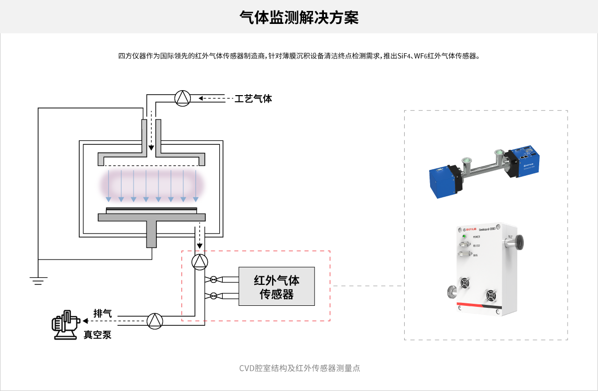 傳統(tǒng)方法依賴經(jīng)驗(yàn)時(shí)間控制,但實(shí)際最佳清潔時(shí)間受沉積厚度、溫度、壓力等因素影響,且參數(shù)可能漂移。因此,多數(shù)工藝會(huì)延長(zhǎng)清潔時(shí)間以確保徹底清潔,但造成資源浪費(fèi)。Johnson等(2004)提出通過(guò)監(jiān)測(cè)SiF?分壓確定清潔終點(diǎn)。紅外氣體傳感器因其高實(shí)時(shí)性和可靠性,已成為主流檢測(cè)手段。
